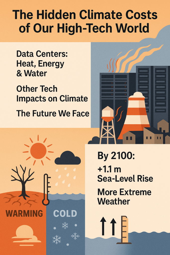 Every new gadget and online service comes with a hidden climate cost. While tech promises convenience, the electricity and resources it consumes pump extra greenhouse gases into our atmosphere. Scientists note the world has already warmed about 1.1 °C since 1900 – an unprecedented rise in millennia, driven by our burning of fossil fuelsscied.ucar.edu. Now studies warn the digital boom will only increase that warming. For example, MIT researchers report global data center electricity needs (especially for AI and cloud services) could double by 2030 – reaching ~945 terawatt-hours per year, comparable to Japan’s total power usenews.mit.edu. Since much of this comes from coal and gas plants, it could add roughly 220 million tons of CO₂ annually (the same as thousands of car-years) by 2030news.mit.edu. In short, our tech-driven energy hunger is adding more heat-trapping gases to the planet every day.